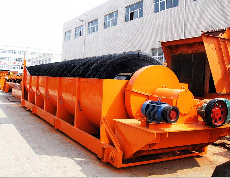 砂石洗選機(jī)工作過(guò)程中,物料由給料箱均勻給入,連續(xù)給主槽體中注入一定量的水,傳動(dòng)部帶動(dòng)螺旋軸以一定的速度旋轉(zhuǎn),迫使物料在槽體中翻轉(zhuǎn)滾動(dòng)并向排料口運(yùn)動(dòng),細(xì)粒級(jí)物料和雜質(zhì)隨溢流水經(jīng)溢流堰排出,粗粒度物料由排料口排出,從而實(shí)現(xiàn)物料的洗選、分級(jí)、除雜和脫水。